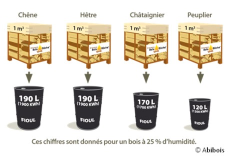 Un bois sec prêt à l’emploi (moins de 25 % d’humidité rapportée à la masse brute) contient deux fois plus d’énergie qu’un bois fraîchement coupé (55 % d’humidité rapportée à la masse brute).