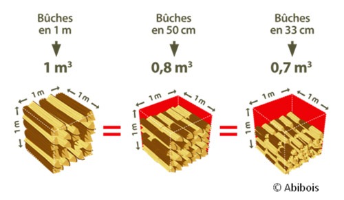 En effet, si la taille des bûches est inférieure à 1 m, le volume de bois apparent diminue car les vides sont mieux occupés. Ainsi votre « stère » ne correspond plus à 1 m3, mais à 0,8 m3 pour des bûches en 50 cm et 0,7 m3 pour des bûches en 33 cm.